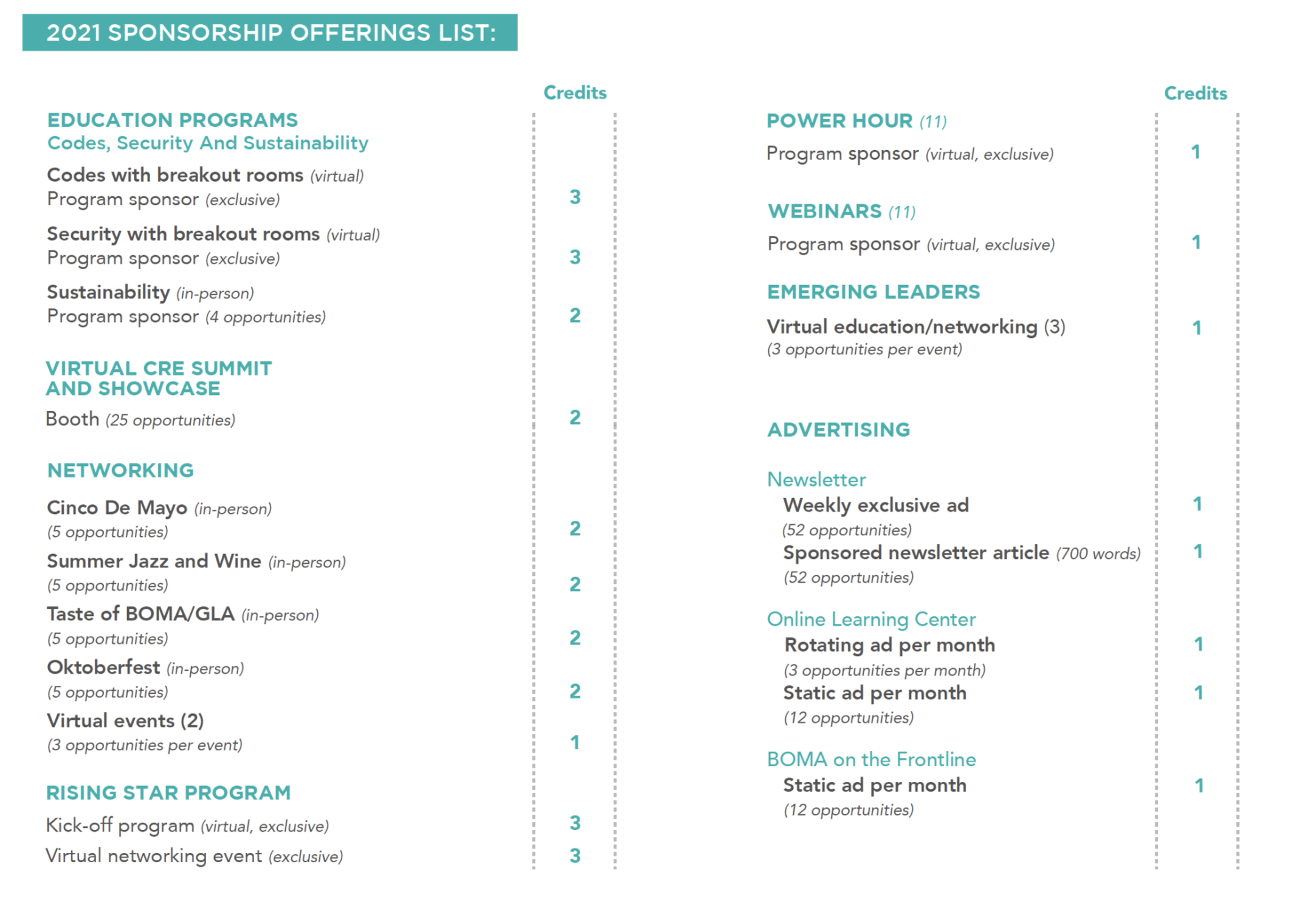 SUMMARY:BOMA/GLA Associate Membership Credits Opportunities